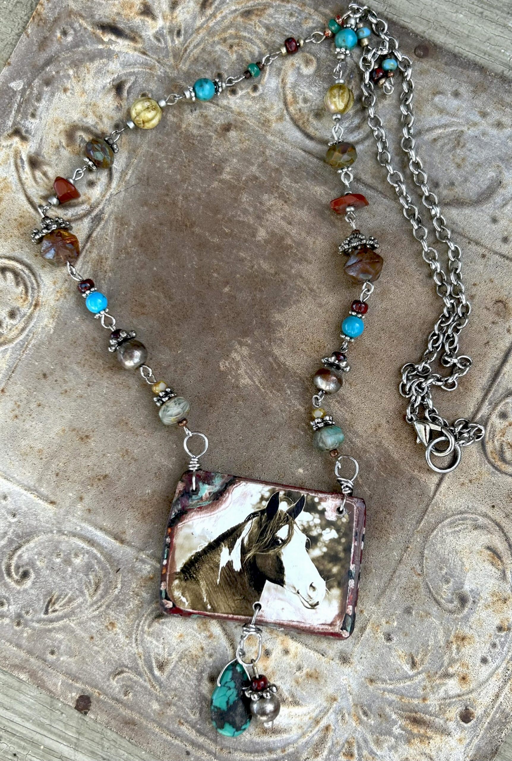 This mixed media, art photo necklace features a Choctaw tribal horse stallion, descendant of old tribal pony bloodlines.